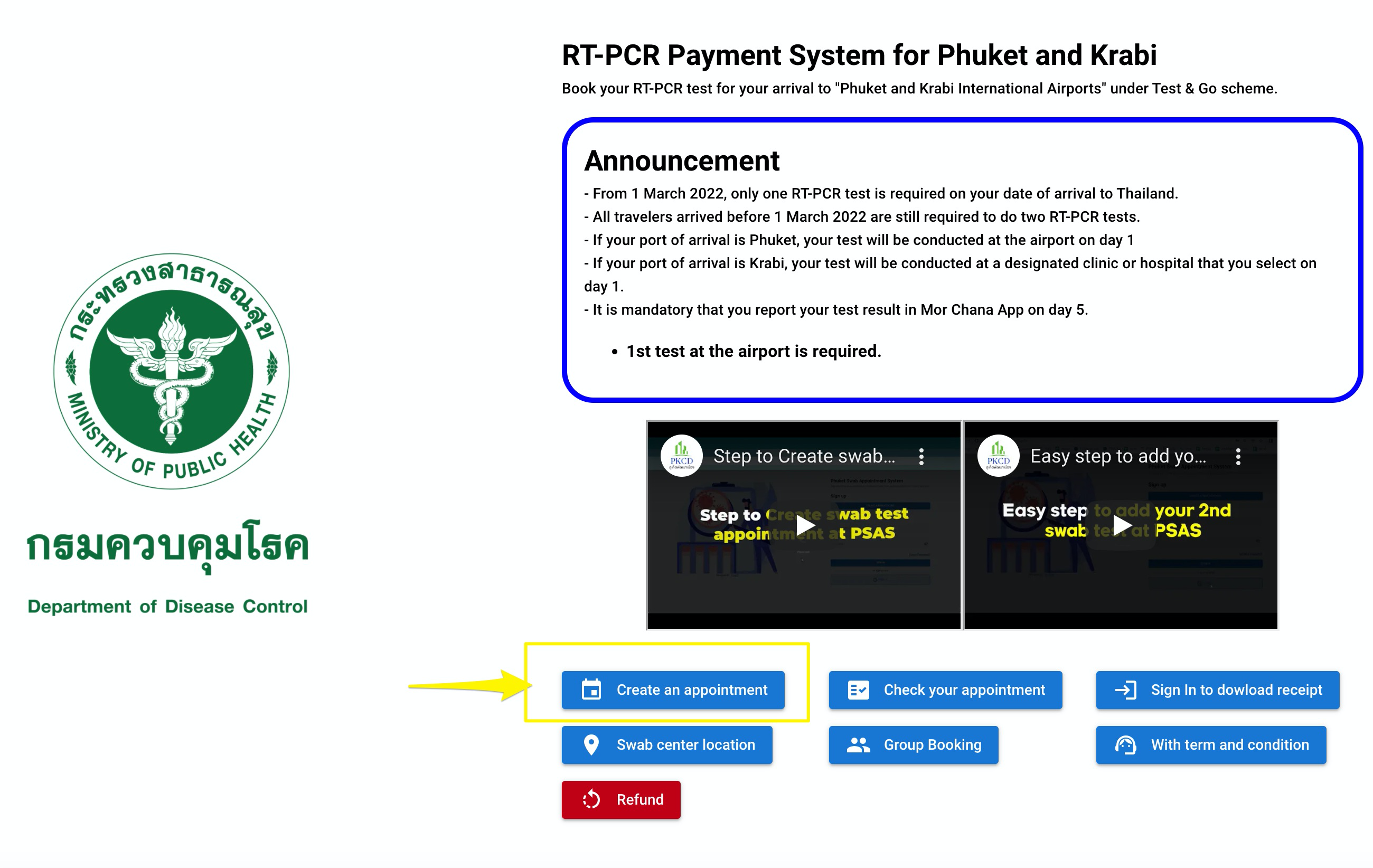 푸켓입국은 방콕 입국과 달리 직접 PCR 테스트를 직접 예약해야 한다. 공항에서 도착 후 바로 PCR 테스트를 하고, 그 후에 호텔로 이동하고 결과를 기다린다. PT-PCR 신청은 웹사이트 (https://www.thailandpsas.com/) 에 들어가서 Create Appointment 를 누르면 된다. 가격은 2100 THB (약 7만 7천원) 이고, 예약을 완료하면 영수증을 준다. 이 영수증은 나중에 타이패스를 신청할때 첨부해야 함으로 잘 간직해야한다.