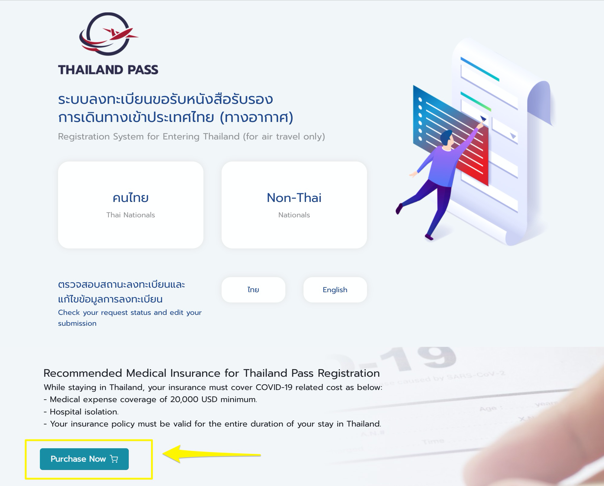 FWD 보험을 구매하기 위해서는 타이패스 신청 웹사이트 (https://tp.consular.go.th/home) 에 가서, 아래에 보이는 Purchase Now 버튼을 눌리면 된다.